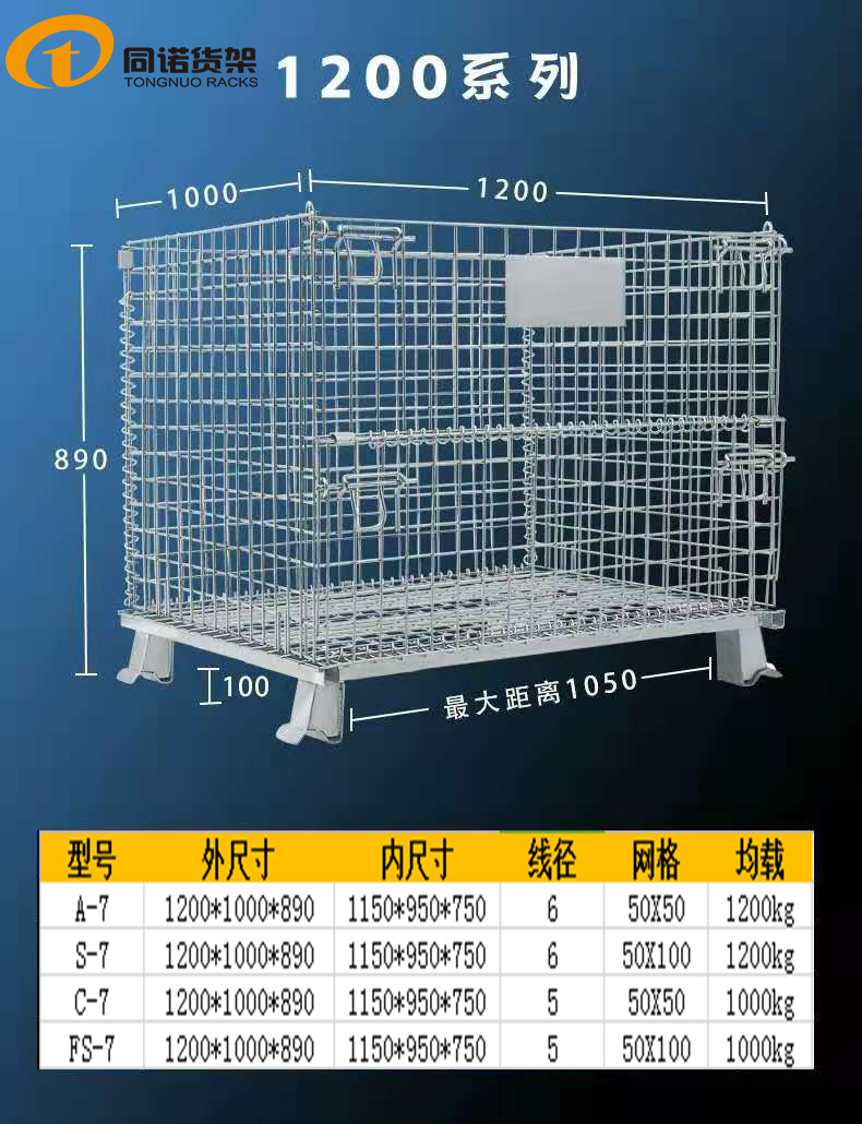 A-7仓储笼也叫A7仓储笼,1200长度仓储笼,1.2米长度仓储笼,a7仓储笼,是国内使用比较多的标准仓储笼规格之一,因为它的底部是符合标准托盘尺寸设计,所以使用的范围也是很多。A-7仓储笼的标准尺寸为长1200*宽1000*高890,内部有效使用高度为750,底部脚高100.